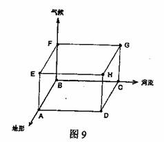 图中(图9),各坐标轴分别表示气候、地形、河流三种区位因素,箭头指示方向表示区位条件越来越好。读图回答19-20题。