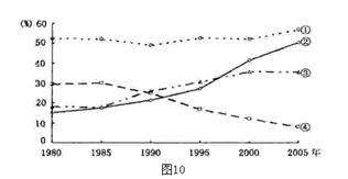 读“江苏省三大产业产值比重与城市人口比重的变化图”(图10),回答21-22题。