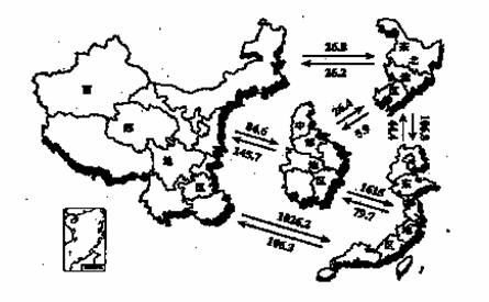 图13 我国四大地区之间人口流动示意图(单位:万人 2000年)