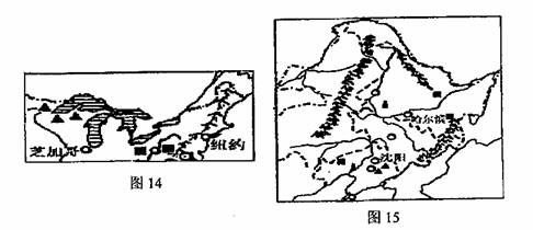 28.图14是“美国东北部地区简图”,图15是“中国东北地区简图”,请你比较这两个地区自然环境、社会经济条件等方面的特征,回答下列问题。(12分)
