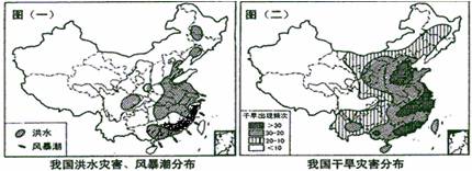 (1)根据图(一)和图(二)概括我国洪涝和干旱灾害的分布规律。(10分)
