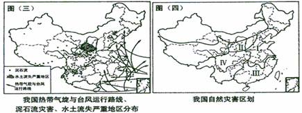 36.(20分)下图(一)、(二)、(三)是“我国部分灾害分布”示意图,图(四)是“我国自然灾害区划”示意图。读图并回答问题。
