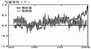 (1)读图,分别描述全球年平均气温变化模拟值和观测值的特点并简析原因。(6分)