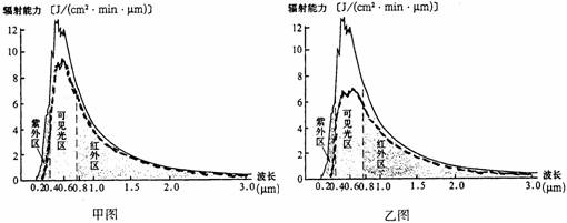 下列甲、乙两图为我国不同的两地太阳辐射图,图中虚线曲线为到达地面的实际太阳辐射。据此完成以下10--11题