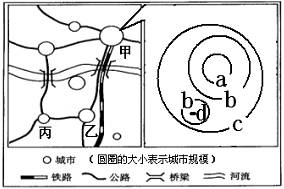 D.乙、丙都是甲城的卫星城,服务功能相同