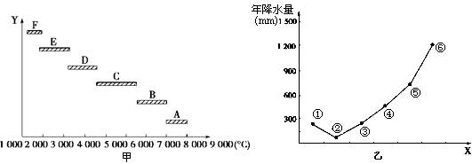 某研究人员依据我国多年平均气候资料,按一定方向分别选取了A-F和①-⑥共12个地区,分类绘成甲、乙两图,读图完成10-11题: