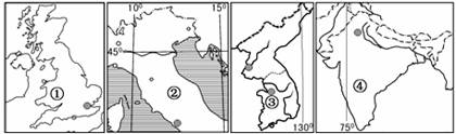 1.若上图中数码所在国家上班时间是8:00~12:00,14:00~18:00,首脑会晤前我国向四国首脑发出电话邀请,能保证上班时间四国首脑同时接听到电话,我国开始打电话的最佳时间应选在 ( )