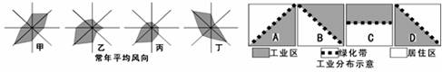 2.上图中数码所示地与下列“常年平均风向”、“工业分布”示意图连线正确的是 ( )