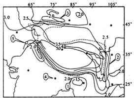 下图中等值线所注明的数字为最大年降水量出现高度,单位千米。读图回答9-11题。