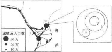 读某地区城市分布及图中甲城市地租等值线示意图,回答7-9题。