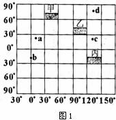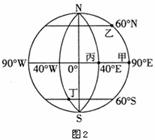 图2中,有甲地(0°,90°E)、乙地(60°N,90°E)、丙地(0°,40°E)、丁地(60°S,40°W)四地,据图回答2-3题
