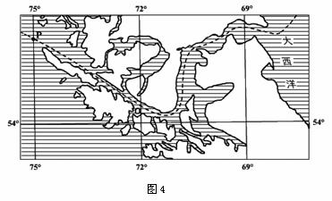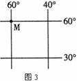 4.图3中一架飞机从M点出发以每小时l100千米的速度向北飞越北极点后继续沿经线圈飞行,8小时后到达地的地理位置是 ( )