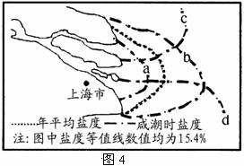 咸潮,又称咸潮上溯、盐水入侵,内河含盐量超过一定标准,水体变咸即形成咸潮,近年来某些河口三角洲地区由于咸潮问题凸显,受到广泛关注。2010年,上海将举办举世瞩目的世博会,“城市,让生活更美好”的主题已深入人心。然而,目前上海的城市供水现状却令人担忧:夏季的用水高峰和冬春咸潮造成全市供水趋紧。而近年,上海先后经受了近10次咸潮侵袭,影响程度为历年之最。据此并结合图4回答9-11题。