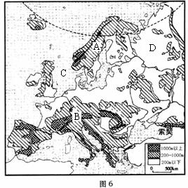 (4)图中D所在国家东部自南向北有注入北冰洋的三条大河,试分析这三条河流下游农业不发达的自然原因。(6分)