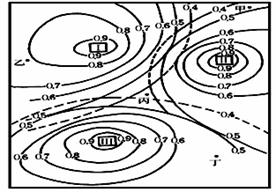 下图是三个同等规模商业中心对周围顾客达成交易的概率的等值线分布图。读图分析回答5--6题。