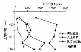 读云南路南石林不同植被下土壤空气中CO2浓度示意图,完成7--8题。