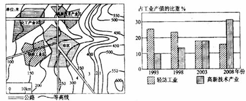 材料一 M市等高线地形图 材料二 M市产业结构的变化图