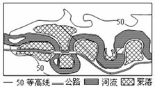 C.河流总体自东向西流 D.该地区聚落沿河流分布于河流凸岸一侧