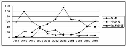 14.江苏1997-2007年资本、劳动力、技术创新等因素对经济增长贡献率的变化特征,叙述错误的是