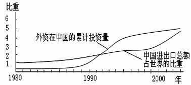 读1980~2003年我国进出口总额和外资直接投资累计量占世界比重变化图,回答18-19题。