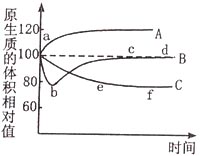(1)在A,B,C中,细胞在蒸馏水中的是_______;在0.5g/mL尿素溶液中的是________。 (2)ab段的下降速度较ae段的快,这是因为______________________________;cd段的细胞所处的溶液浓度______0.5g/mL(>、<或=)。 (3)试简要分析B、C曲线差异的原因:________________________________________