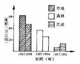 51.(6分)下图是科学工作者对我国北方地区森林、草地和荒漠地面积变化的调查结果,这对分析说明我国今春以来华北地区多次出现的沙尘暴天气有很大帮助。
