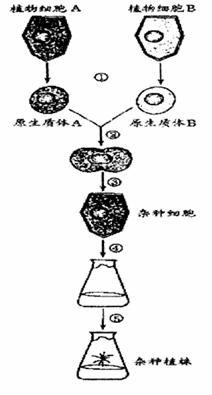 4.右图为植物体细胞(2N)杂交过程示意图。据图回答: (1)步骤①的目的是分离有活力的原生质体,最常用的方法是__________。 (2)步骤②一般常用的化学试剂是__________,目的是诱导原生质体融合,完成的标志是出现 。 (3)在利用杂种细胞培育成为杂种植株的过程中,运用的技术手段是__ ________,其中步骤④相当于__________,步骤⑤相当于__________。 (4)植物体细胞杂交的目的是获得新的杂种植株,使远源杂交亲本的性状能够在新的植物体上有所表现,其根本原因___ ____。 (5)从理论上讲,杂种植株可育,若运用传统有性杂交方法能否实现?__________。并说明理由__ ________。因此,这项研究对于培养作物新品种方面的重大意义在于 。
