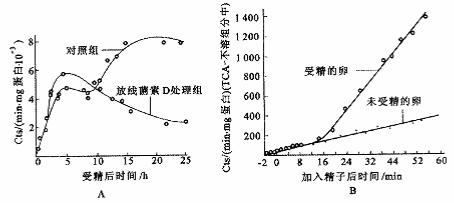 实验二:将未受精的海胆卵和受精的海胆卵分别悬浮在含有14C-亮氨酸的条件下进行培养(0时间表示受精的时刻),定时测定细胞中放射性亮氨酸的掺入累积量,得到的实验结果绘制成的曲线如图B。