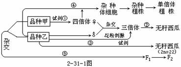 31.(21分)现有味甘汁多、消暑解渴、稳定遗传的绿皮(G)、红瓤(R)、小籽(e)西瓜品种甲与白皮(g)、黄瓤(r)、大籽(E)西瓜品种乙,三对基因自由组合。已知西瓜的染色体数目2n=22,请根据下面提供的西瓜育种流程2-31-1图回答有关问题: