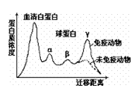 对免疫动物和未免疫动物的血清蛋白用电泳的方法进行分离,可以在电泳薄膜上看到四个组分:血清白蛋白和α、β、γ球蛋白,它们的相对浓度如图所示。请据图判断抗体主要属于(电泳:血清蛋白中的各组分胶粒大小不一,所带电荷数量和电性也不相同,将它们放在一光滑导电的特制的薄膜上,在薄膜两端通以直流电源,这些组分带电颗粒就会在电场力作用下发生迁移而被分离开来,并通过显色反应可测出各组分的相对浓度)。 ( )