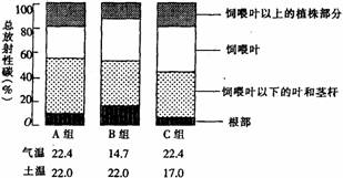 31.(8分)科学研究表明,环境因素会影响到植物体内有机物的运输。为了研究温度对植物体内有机物运输的影响,有人设计,在不同组合的气温与土温条件下,用14CO2饲喂甘蔗叶片,经过12h光合作用后,测定饲喂叶、饲喂叶以上的植株部分、饲喂叶以下的叶和茎秆、根部中含14C的光合产物分布情况,结果如下图所示。请据此回答: