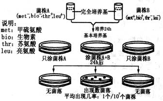 对两种不同的营养缺陷型大肠杆菌进行如下图所示的培养:请回答,基本培养基中只分布菌株A或B、不出现菌落的最恰当的解释是 (说明:如met-是甲硫氨酸缺陷型