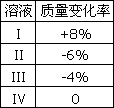 16.(2006上海生物32)将相同的四组马铃薯条分别浸入四种溶液,一小时后测定薯条质量变化的百分率,结果如右表。下列叙述中正确的是