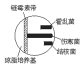 29.实验测定链霉素对3种细菌的抗生素效应,用3种细菌在 事先准备好的琼脂块平板上画3条等长的平行线(3条线均与下图中链霉素带接触),将平板置于370C条件下恒温培养3d,结果如图所示,从实验结果看以下关于链霉素的哪一叙述是正确的