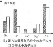 15.如右图所示,对法囊藻(一种海藻)的细胞液中各种离子浓度的分析表明,细胞液中的成分与海水的成分很不相同。请据图回答下列相关问题: (8分)