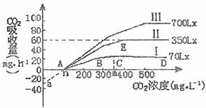 生产实践表明:在一定范围内,提高CO2浓度,能提高光合作用效率。下图所示,是对某农作物实验的结果,请据图分析并回答:(Lx:勒克斯,光照强度的单位。A、B、C、D、E为曲线上的点;a、m、n为坐标轴上的点;a点表示-30)