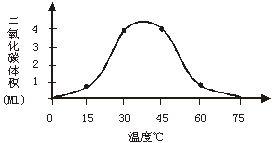 32、(6分)当酵母加到生面团时中时,酵母细胞会产生二氧化碳,使生面团膨胀。下面的曲线就显示了温度对二氧化碳产生量的影响。根据这个曲线回答以下问题
