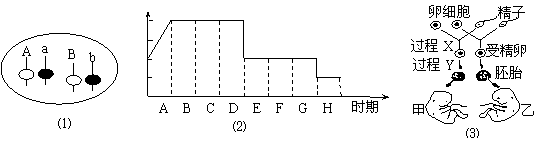 37.(7分)下图(1)为某夫妇含有AaBb两对等位基因的一个体细胞示意图,图(2)为某细胞分裂过程中DNA含量变化曲线图,图(3)为该妇女在一次生殖过程中生出男孩甲和女孩乙的示意图,请根据图回答下列问题: