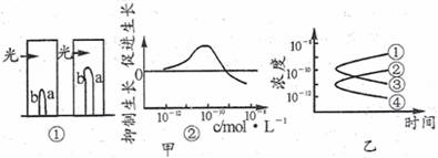 7.图的 甲中(1)表示燕麦胚芽鞘在单侧光照下的生长情况,(2)表示胚芽鞘对不同浓度生长素的不同反应,则乙中表示A.b两点生长素浓度变化的曲线应分别是 ( )