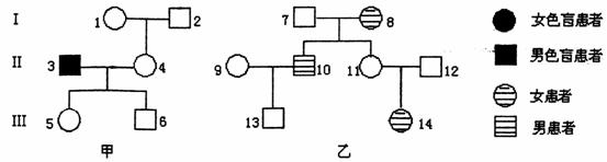 10 分)下图为两个家族的遗传系谱图,已知甲家族是患色盲。请回答下列问题:![]()