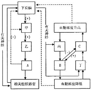 ( 2 )当正常人处于饥饿状态时,图示中 (填字母)增多,在机体内通过促进过程,以维持机体的血糖平衡。如果图中 部位受损,会使人患糖尿病。 ( 3 )当人体受到寒冷刺激时,兴奋只能由大脑皮层的神经细胞传到下丘脑的神经细胞,而不能反向的原因是 。 ( 4 )血液中物质A 的含量过高时,抑制下丘脑和甲的分泌活动,该调节方式称为 。