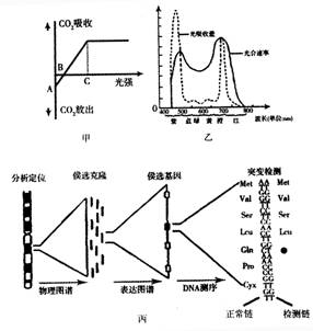 (4)研究人员用波长为300-400nm的光线照射植物幼苗,获得一种使甲图中C点右移的新状,通过“定位克隆法”分析DNA分子得知该新性状由单基因控制,并进一步将基因定位在某一色体的特定部位(图丙,Met等表示不同的氨基酸),当初步确定突变基因的位置后,需要对基因行克隆,则:获取有关基因的工具是_________酶,基因克隆必需的酶是________