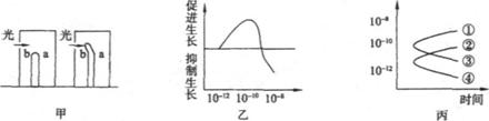 33.甲图表示燕麦胚芽鞘在单侧光照下的生长情况,乙图表示胚芽鞘对不同浓度生长素的不同反应,则丙图中表示a、b二点生长素浓度变化的曲线应分别依次是