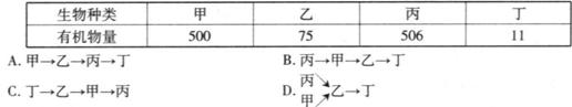 4种生物(甲、乙、丙、丁)所含有机物的总量如下表所示,这条食物链关系可表示为