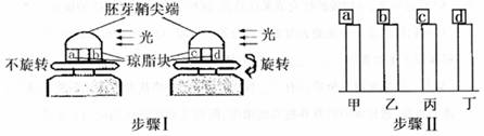(2)实验步骤I中旋转琼脂块和胚芽鞘尖端的目的是 。如果不采用旋转的方法,还可以用什么方法来研究? 。