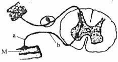 9.下图为反射弧模式图。在a、b两处分别给予电刺激,M开始反应的时间情况如下表:则神经冲动从b处到达M的时间(ms)是 ( )
