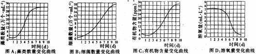6.在实验室条件下培养藻类,在培养液中加入足量的离子和足量的氮和磷,实验过程中,光照适宜,每天测定四项数据:藻类数量的变化、装置内有机物总量的变化、细菌的数量变化、溶氧量的变化。根据实测数据绘制出相关的四条曲线,如图所示。据此判断下列说法中错误的是