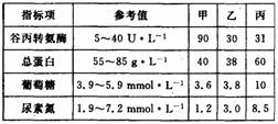 11.下表为甲、乙、丙三个病人早晨空腹时血清中的部分指标值。相关判断不合理的是