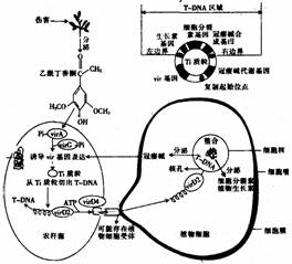 由该图可以看出,virA作为受体蛋白接受损伤植物细胞分泌物的诱导,自身磷酸化后进一磷化激活virG蛋白,后者是一种DNA转录活化因子,被激活后可以特异性结合到vir基因上,启动基因的转录。其中,virD基因产物对T-DNA进行剪切,产生T一DNA,然后将T-DNA与virD2组成的复合物转入植物细胞,随后转入细胞核,最后T一DNA随机整合到植物染色体上。