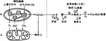 高等动物细胞结构乙中的生理过程是 (填序号),在缺氧情况下,物质